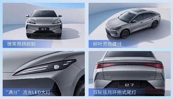 За зовнішнім виглядом BYD e7 виконаний у типовому для бренду стилі. Дверні ручки мають звичайну конструкцію без автоматичного висування, а колісні диски мають діаметр 16 дюймів. Розміри автомобіля становлять 4780 мм у довжину, 1900 мм у ширину та 1515 мм у висоту при колісній базі 2820 мм. Це робить седан доволі просторим, що важливо для таксистів, яким доводиться перевозити пасажирів із багажем.