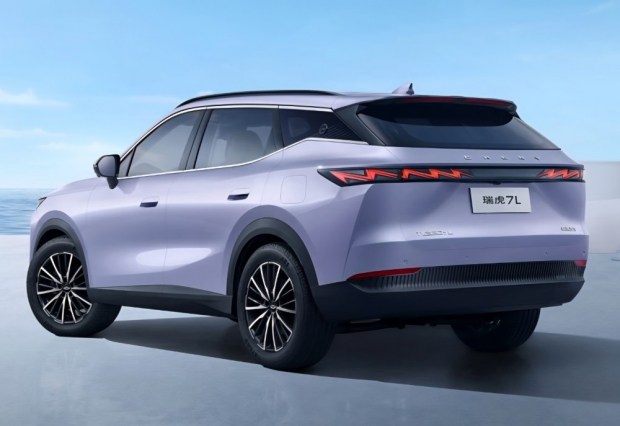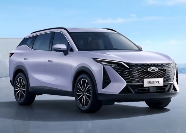 Судячи з опублікованих фото, Tiggo 7L отримав більш виразну передню частину з великою V-подібною решіткою радіатора, в центрі якої інтегрований логотип марки. Вузькі фари візуально зливаються з решіткою, формуючи цілісну композицію. Додатково передбачено три менші повітрозабірники - два з боків і один у нижній частині бампера. Масивна решітка натякає, що йдеться про версію з бензиновим двигуном.