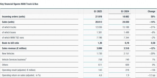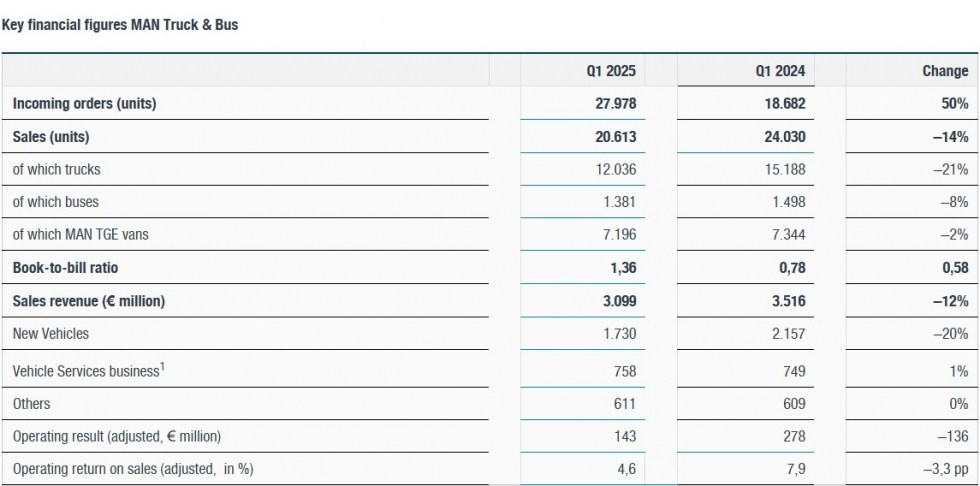 Компанія MAN Truck & Bus завершила перший квартал 2025 року з помітним зниженням ключових фінансових та виробничих показників у порівнянні з аналогічним періодом 2024 року. За перші три місяці цього року було реалізовано 20 600 одиниць продукції, що на 14% менше, ніж у першому кварталі минулого року. Основним фактором падіння стала слабка динаміка постачань у країни ЄС27+3, що традиційно є для MAN одним із найбільших і стабільних ринків збуту. Через це загальний виторг компанії у січні-березні 2025 року зменшився до 3,1 мільярда євро, що становить 12% падіння порівняно з аналогічним періодом 2024-го.