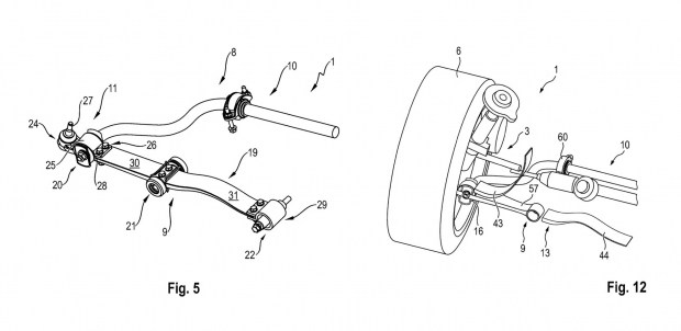 Автором розробки вказаний інженер Фрік Ондрей. На патентних схемах представлено кілька варіантів компонування, але загальна логіка конструкції нагадує еволюцію підвіски типу McPherson. У запропонованому рішенні композитна ресора фактично замінює один із елементів нижнього важеля, зберігаючи незалежну схему роботи колеса й водночас скорочуючи вертикальні габарити вузла. Це дає змогу зменшити висоту стійки, опустити лінію капота та відкрити додаткові можливості для дизайну й аеродинаміки.