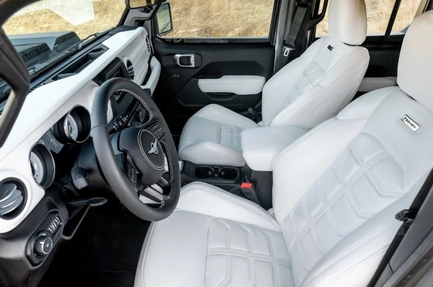 Салон Jeep Wrangler майже не змінився - його лише обшили дорогою шкірою. Також розкрили перелік опцій для Rezvani Tank. У пакеті за 42 000 доларів пропонують димову завісу, протигази, електрошокери в дверних ручках та шини, які не бояться проколу.
