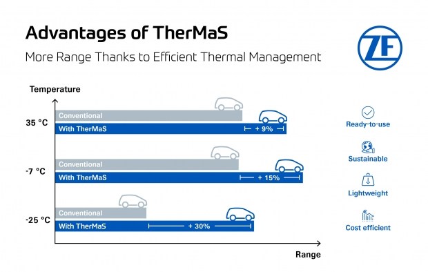 Для підвищення ефективності електроприводів і, відповідно, прийнятності електромобільності, ZF реалізує комплексний інноваційний підхід. Одним із прикладів є система TherMaS - термічне управління, розроблене спеціально для електромобілів. Використання пропану як холодоагенту забезпечує значно кращу теплову продуктивність при високих і низьких температурах, а також компактніший і легший дизайн. У тестах оптимізоване теплове управління та ефективніше використання відпрацьованого тепла збільшили запас ходу електромобіля взимку до 10%, а в екстремальних умовах - до 30%.