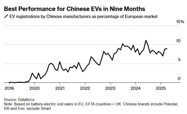 За даними Dataforce, минулого місяця на китайські бренди припало 7,6% продажів гібридних автомобілів у Європі, тоді як роком раніше цей показник становив менше ніж 1%.