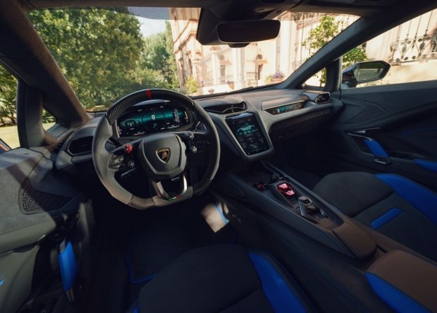 Салон Temerario Porto Cervo гармонійно продовжує зовнішню стилістику. Для оздоблення інтер'єру використані шкіра кольору Grigio Octans та тканина Corsa Tex, доповнені вставками з синьої шкіри Blu Nethuns на сидіннях і дверях. Вишитий логотип Lamborghini на спинках сидінь та напис «Temerario» з триколором Італії на задній стінці салону підкреслюють походження моделі. Особливою деталлю стала вишивка профілю Temerario на дверних панелях - це вперше в історії бренду подібний художній штрих з'явився в оздобленні. Центральний тунель, панель приладів та елементи керування дверима виконані з матового карбону. Кермове колесо обтягнуте матеріалом Corsa Tex з червоними акцентами - це не просто розкіш, а функціональний спортивний інструмент для водія.