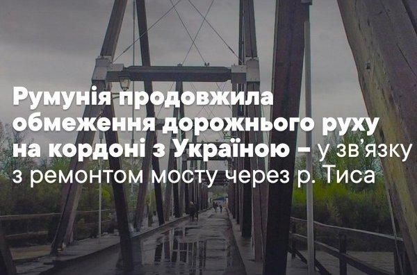 Румунія продовжила обмеження руху на кордоні з Україною через ремонт мосту на Тисі27 жовтня 2025Як зазначає румунська сторона, автомобільний рух буде закритий для проведення ремонтних робіт інфраструктури мосту з 27 жовтня терміном на 33 дні у проміжок часу з 9:00 по 15:30 год.