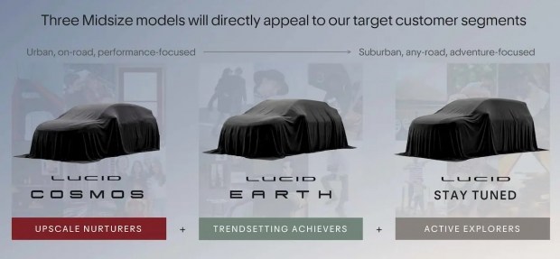 Американський виробник електромобілів Lucid Motors представив два нових електричних кросовери - Lucid Cosmos та Lucid Earth. Це перші моделі бренду, створені на новій платформі середньорозмірних електромобілів, а їхня стартова ціна становитиме менше ніж 50 000 доларів.