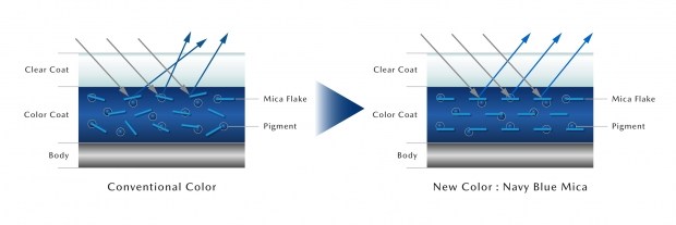 Під час створення Navy Blue Mica команда дизайнерів і технологів керувалася ключовим принципом «високої роздільної здатності». Йдеться про прагнення до максимальної точності та чистоти кольору, а також до високого контрасту, що підкреслює рельєф і чіткість кузовних ліній. Для цього було використано вивірене поєднання різних типів частинок слюди, які розташували горизонтально в шарі фарби. Така структура дозволяє досягти яскравої насиченості у світлих ділянках кузова та глибокої, стриманої елегантності в тінях. Виробник наголошує, що деталі дизайну залишаються виразними за будь-яких умов - як під прямим сонячним світлом, так і під дощем.