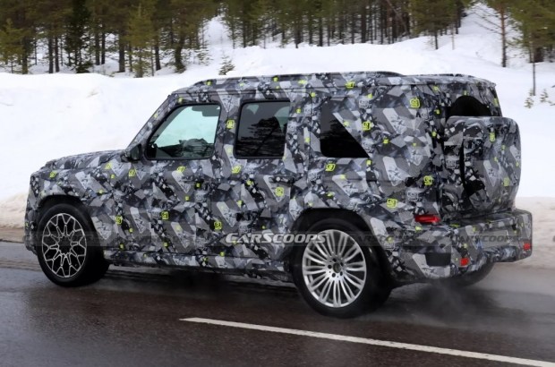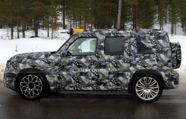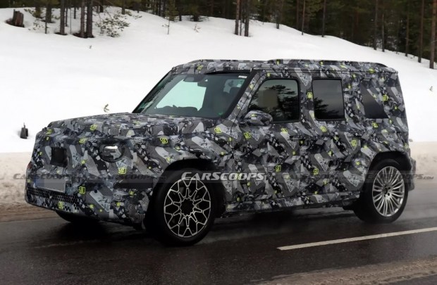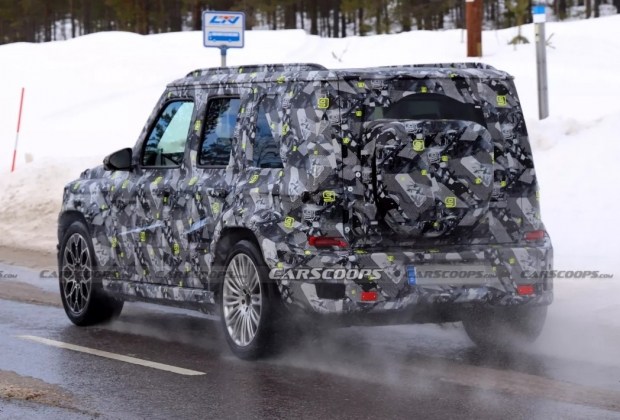 Зовнішність майбутнього позашляховика залишиться максимально впізнаваною. Навіть попри камуфляж, прототип демонструє класичні пропорції G-Class: квадратний силует кузова, круглі фари, масивні розширені колісні арки та запасне колесо на дверях багажника. На тестовому камуфляжі також помітні численні літери «g», які натякають на зменшений масштаб моделі.