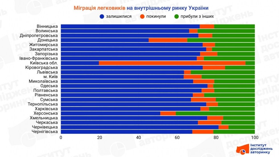 Інша крайність - Чернівецька область, де понад 81% авто залишились у межах регіону. Тут спостерігається досить замкнутий внутрішній ринок, із низьким рівнем «відтоку». Схожа ситуація - в Тернопільській, Хмельницькій, Одеській та Закарпатській областях.