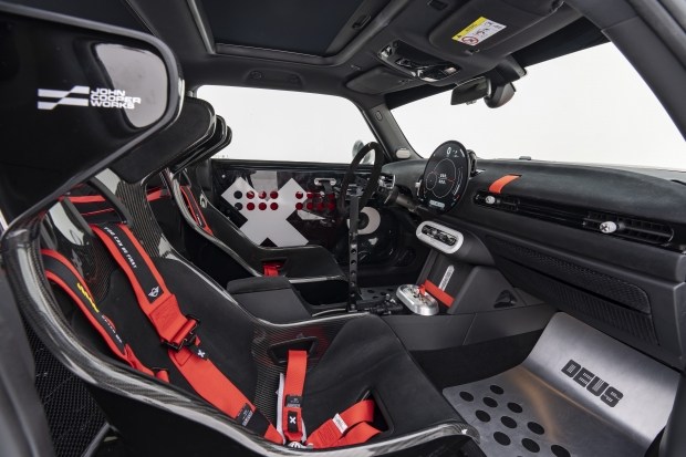 Версія JCW The Machina натхненна автоспортом і виконана у червоно-біло-чорній гамі з контрастною графікою на даху та асиметричними елементами на кузові. Дизайнери встановили розширені чорні колісні арки, додаткові ретро-ліхтарі на капоті, унікальну решітку радіатора та велике антикрило в стилі легендарних перегонів Can-Am, а також збільшений задній дифузор. Навіть фари зазнали змін - замість стандартної графіки встановлені LED-елементи, що візуально додають агресивності та покращують охолодження завдяки додатковим повітрозабірникам.