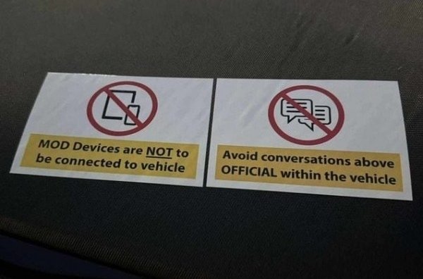 Написи, прикріплені до панелі приладів автомобілів, містять такі заклики: «Пристрої Міністерства оборони не підключати до (цього - ред.) транспортного засобу», а також «Уникайте службових розмов у транспортному засобі».