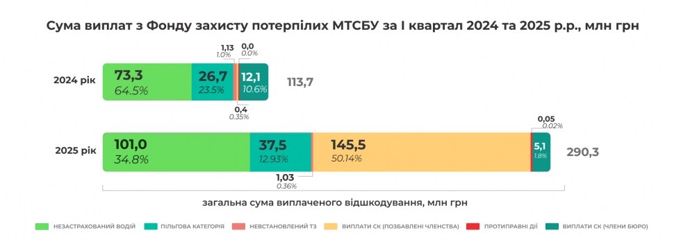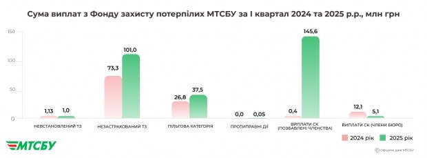 За І квартал 2025 року МТСБУ провело за цією категорією 3 280 регламентні виплати на загальну суму 145,6 млн грн, тоді як у минулому році за цією категорією було здійснено 15 виплат на загальну суму 0,4 млн грн. Питома вага виплат за зобов'язаннями колишніх членів Бюро у січні-березні 2025 року становить 50,14% із загальної суми виплат Фонду захисту потерпілих, для порівняння, у 2024 році ця категорія становила всього 0,35% виплат Бюро.