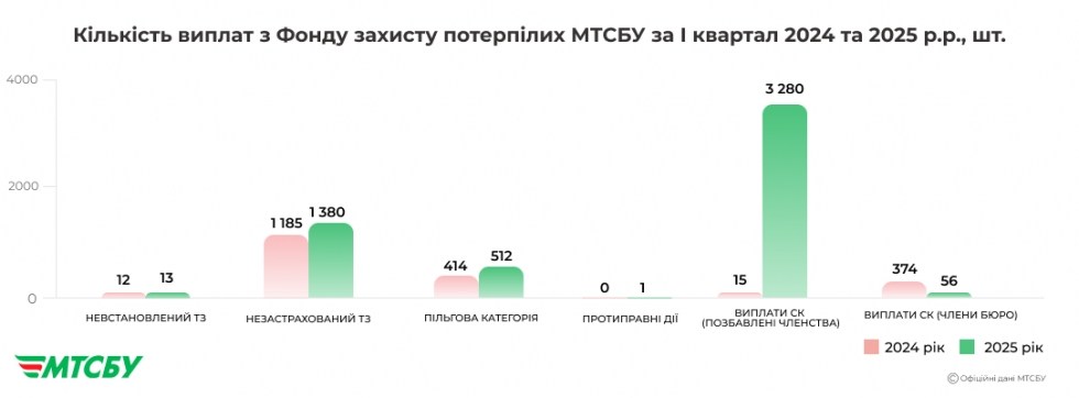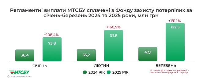За перший квартал 2025 року МТСБУ здійснило 5 242 регламентні виплати з Фонду захисту потерпілих на загальну суму 290,3 млн грн. У порівнянні з аналогічним періодом 2024 року кількість виплат зросла на 162%, а сума виплат - на 155%.