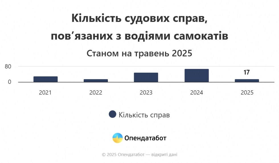 71 судова справа, де фігурують електросамокати, зафіксовано у 2024 році, за даними пошуковика по судовому реєстру «Бабуся». За рік таких справ побільшало на 42%. Вже цьогоріч судовий реєстр налічує щонайменше 17 таких справ. Зазвичай за таке порушення штрафують на суму від 340 до 34 тис. грн та інколи позбавляють водійських прав. Найбільший штраф отримав чоловік, який кермував електросамокатом у нетверезому стані з Одеси.