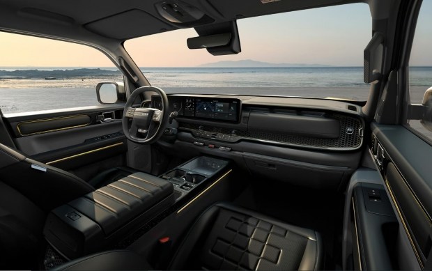 KIA Tasman в Україні продаватиметься у чотири дверному виконанні. У салоні встановлено три екрани на передній панелі, а передні сидіння розділені високою консоллю.
