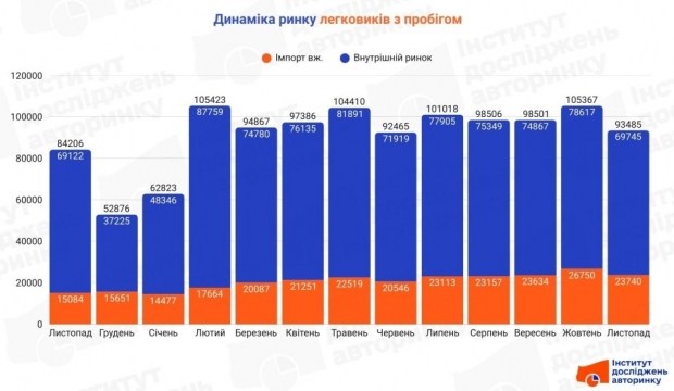 У листопаді 2025 року на першу реєстрацію було подано 23,7 тис. вживаних легкових автомобілів, імпортованих з-за кордону. Цей показник на 11,3% нижчий за результати жовтня поточного року, але на 57,4% вищий за аналогічний період 2024 року.