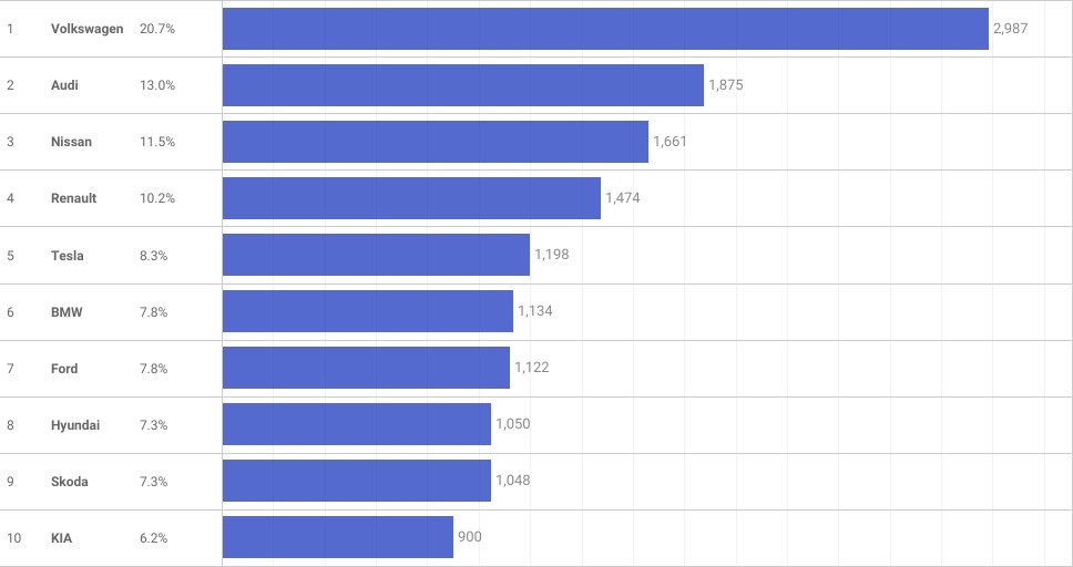Що подавали на першу реєстрацію частіше? Тверду перемогу у цьому заліку отримує Volkswagen, з солідною часткою 20,7%. Також до трійки найпопулярніших імпортованих марок увійшли Audi та Nissan. Renault дісталося четверте місце, а Tesla, яка за підсумками минулого року мала восьму позицію, піднялася на п'яту. Що ми, зрештою, не так давно передбачили.