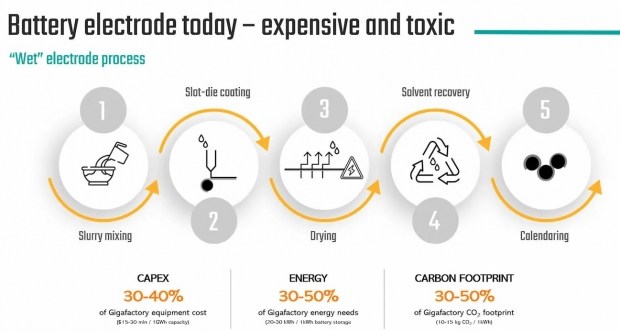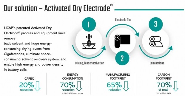 У Nissan вважають, що змогли знайти ефективне рішення. Використовуючи запатентовану технологію LiCAP Activated Dry Electrode, компанія впроваджує процес виготовлення акумуляторів із так званим «сухим електродом». Ця технологія не потребує використання рідких розчинників для нанесення покриття, завдяки чому відпадає необхідність у тривалому сушінні компонентів. Крім того, це сприяє ефективнішому руху іонів усередині елемента, що покращує загальну продуктивність батареї.