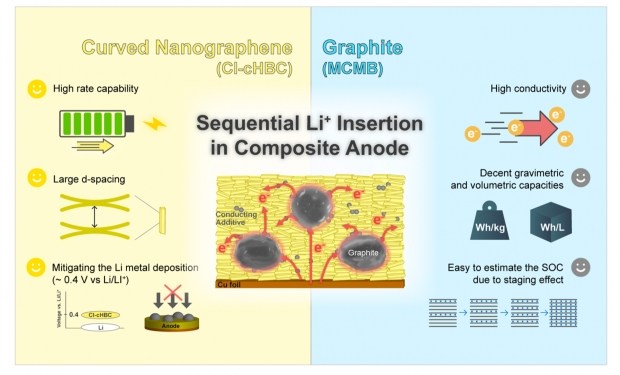 Дослідницька група з Ульсанського національного інституту науки й технологій (UNIST), Корейського університету та Корейського інституту науки й технологій (KIST) створила гібридний анод, що поєднує частинки графіту з вигнутими нанолистами органічного матеріалу - хлорованого гексабензокоронену (Cl-cHBC). Така архітектура утворює розширені міжшарові простори та наноканали, якими йони літію проходять набагато швидше, ніж у звичайних анодах.