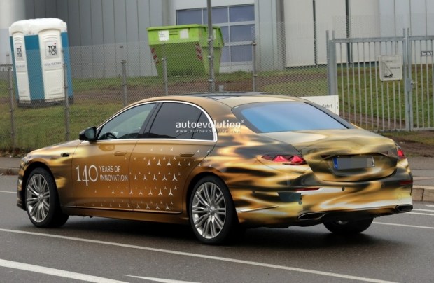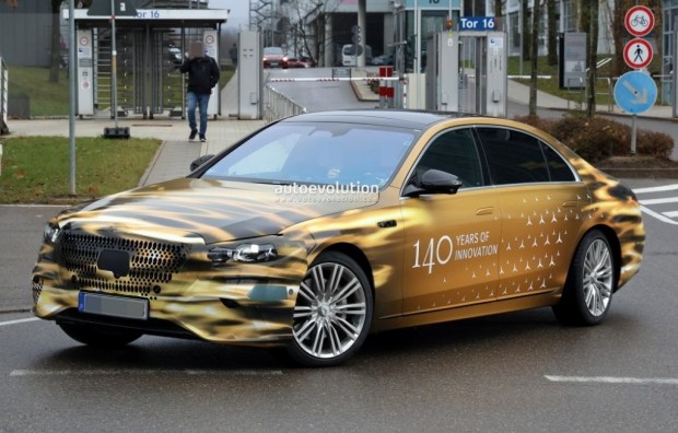 Тестовий прототип Mercedes-Benz S-Class обклеїли яскравою камуфляжною плівкою золотистого кольору, проте деякі деталі дизайну все ж можна розгледіти.