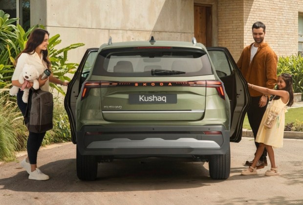 Ззаду Kushaq також змінився. З'явились нові вузькі ліхтарі з'єднані світловою смугою з підсвіченим логотипом Skoda. Це перша модель бренду з таким рішенням. Бампер став масивнішим, а нижня темна секція дифузора додає автомобілю візуальної стійкості. Одразу зі старту продажів доступна й версія Monte Carlo зі спортивними чорними акцентами та червоними деталями.