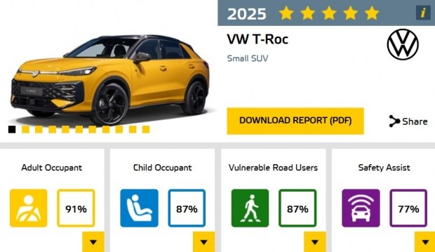 З новим T-Roc ще одна модель Volkswagen отримала максимальну оцінку в п'ять зірок у тестах Euro NCAP. Видатний загальний бал є доказом цілісної концепції безпеки компактного позашляховика, яка відповідає чинній, особливо вимогливій процедурі випробувань. Таким чином, новий T-Roc є одним з найкращих автомобілів у своєму класі. Euro NCAP (Європейська програма оцінки нових автомобілів) оголосила сьогодні вранці останні результати своїх тестів безпеки.
