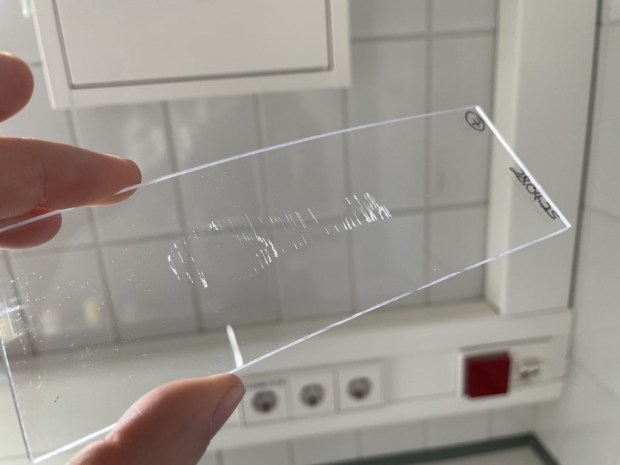 Другий етап це імітація залишків комах. На скло наносять суміш на основі білків і глюкози, яка після висихання дуже міцно тримається на поверхні. Це один із найскладніших типів забруднення.