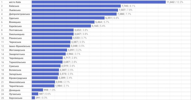 Найбільше реєстраційних операцій на внутрішньому ринку зафіксували у місті Києві: 11,7 тисячі. На другому та третьому місцях відповідно - Київська та Львівська області, з підсумком 7,7 та 7,5 тисяч угод купівлі-продажу.