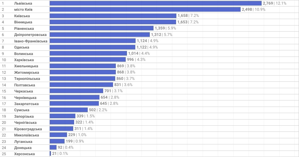 ?Як і минулого місяця, найактивніше реєстрували вживані легковики з-за кордону на Львівщині (2,8 тис. перших реєстрацій.), в місті Києві (2,5 тис.) та Київській області (1,7 тис.).