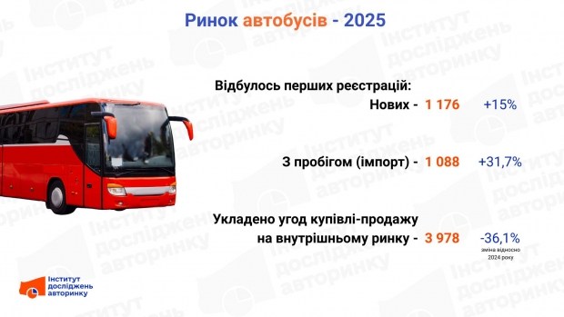 У цьому сегменті бачимо збільшення інтересу перевізників до нових машин (на 15%) - тут свій вплив має закупка машин місцевого виробництва для міських чи міжміських перевезень, рідше - купівля нових автобусів міжнародними перевізниками. На 32% зріс імпорт автобусів з пробігом, натомість на 36% просіли внутрішні перепродажі. Тож маємо тренд на оновлення парку пасажирських машин, але застій з торгами тими, що вже мають реєстрацію в Україні. Сумарно ж куплено автобусів на 1833 одиниці менше, ніж у 2024. Тобто, ще одна частина комерційного транспорту зі знаком мінус.