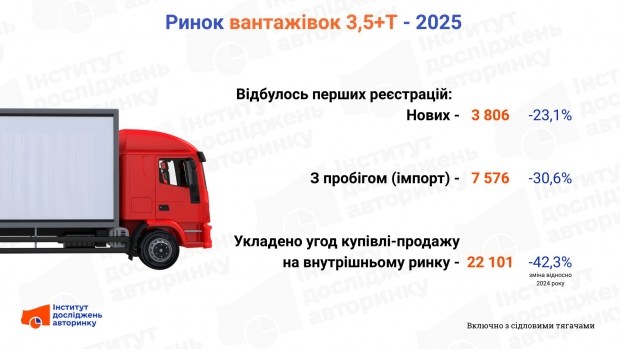 У цьому розділі ми підіб'ємо підсумки для всіх вантажівок з повною масою понад 3,5 тонни, включно з сідловими тягачами, які зазвичай ми оглядаємо окремо (як і напівпричепи для них). І тут маємо набір з трьох мінусів: посіли усі підсегменти цієї частини авторинку. Менше, на 23% (у порівнянні з 2024 роком) куплено нових вантажівок, на 31% «свіжопригнаних», та на 42% менше укладено угод купівлі продажів на «вторинці». Сегмент впевнено стагнує, і це, нагадаємо, не причина, а наслідок.