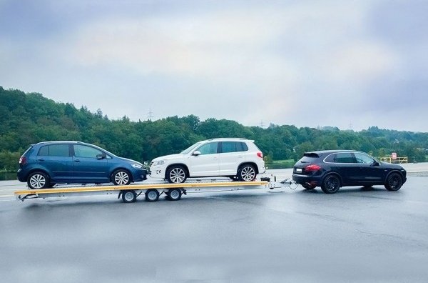 Якщо це було б в Україні, то водієві такої машини патрульний міг би дорікнути хіба що за відсутність в посвідченні водія відповідної категорії, оскільки з фото видно, що максимальна маса причепа разом з двома автомобілями перевищує 750 кг. Й до того ж сумарна маса автопоїзда перевищує 3500 кг та й вісь тут не одна і не дві, що потребує відкритої категорії BE.