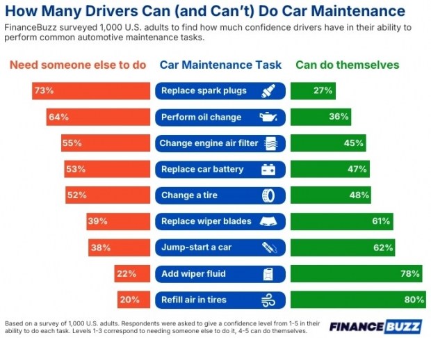 Майже три чверті респондентів (73%) сказали, що для заміни свічок запалювання їм знадобиться допомога - це єдине завдання із ще нижчим рівнем упевненості, ніж заміна оливи.