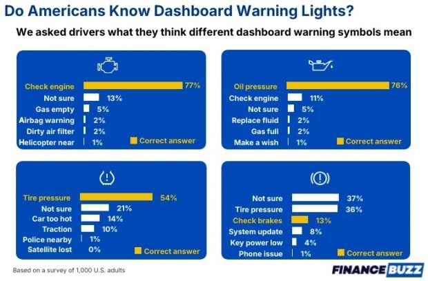 Більшість опитаних впізнали значки Check Engine (77%) та індикатор низького тиску оливи (76%), але лише 13% правильно визначили індикатор несправності гальмівної системи.