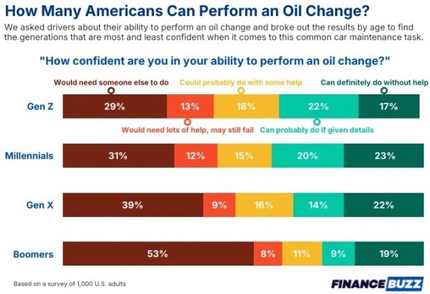 Вік впливає рівень знань про автомобілі: у старших поколінь більше досвіду і часу, щоб освоїти основи обслуговування. Але це не означає, що вони завжди використовують цей потенціал. Наприклад, серед міленіалів найвища впевненість у заміні оливи: 23% сказали, що можуть виконати її без сторонньої допомоги, а ще 20% - що їм потрібно лише уточнити деякі деталі.