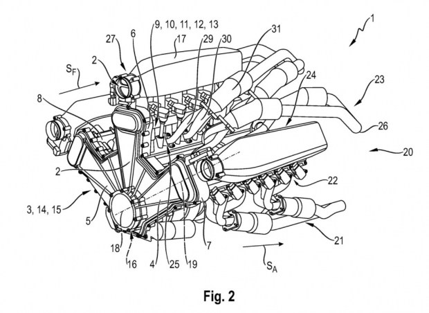 Згідно з патентом, поданим минулого року, а опублікованим лише зараз, Porsche розробляє цей двигун із фокусом на зменшення механічних втрат і підвищення ефективності компонування. У документі зазначається, що кожна головка блоку має принаймні один впускний та один випускний канал. Впускні канали з'єднані з повітряним плінумом, який розташований зверху двигуна й фактично перекриває його всю верхню частину. Така конструкція дозволяє повітрю потрапляти у впускні канали найкоротшим і найпрямішим шляхом - фактично без вигинів, що мінімізує втрати тиску, покращує наповнення циліндрів та сприяє охолодженню повітря. У результаті вдалося досягти чіткішого розділення впускної та вихлопної зон, що підвищує стабільність роботи двигуна під високим навантаженням.
