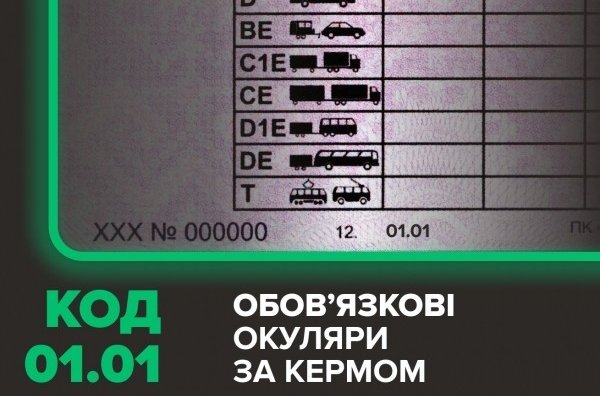 Якщо в медичному висновку зазначено, що особа має користуватися засобами корекції зору (окуляри чи контактні лінзи), у посвідчення водія вноситься відповідний код із групи «01» - наприклад, 01.01 (окуляри) або 01.02 (контактні лінзи).