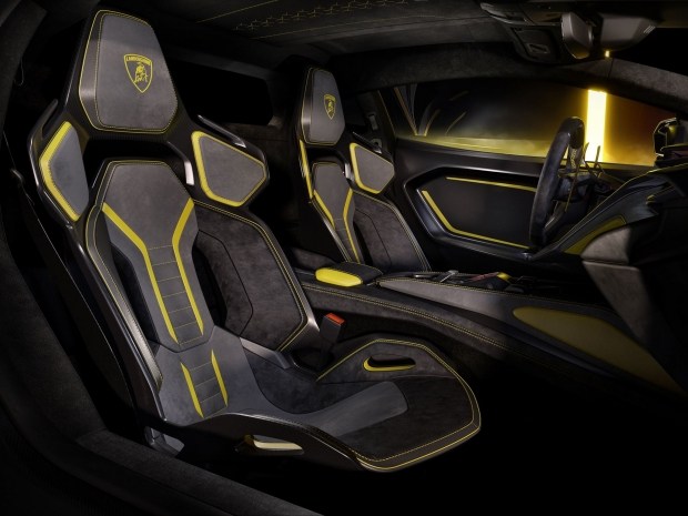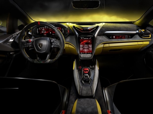 Компонування салону Lamborghini Revuelto із трьома екранами на передній панелі не змінили. Натомість встановили спортивні крісла і пропонують особливі варіанти внутрішнього оздоблення та можливість персоналізації авто.