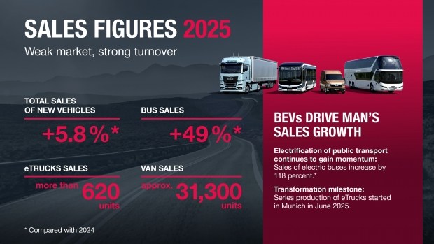 Суттєвий прогрес зафіксовано й у сфері електротранспорту. Після старту серійного виробництва у середині 2025 року MAN продав понад 620 електричних вантажівок важкого класу. Попит на eTruck виявився настільки високим, що портфель замовлень на 2026 рік уже значною мірою сформований. Додатковим кроком у розвитку електричного модельного ряду стане запуск серійного виробництва 12-тонної електровантажівки MAN eTGL, запланований на кінець 2026 року. Паралельно MAN готується до перших поставок електричних туристичних автобусів eCoach, які мають з'явитися у клієнтів наприкінці 2026 року.