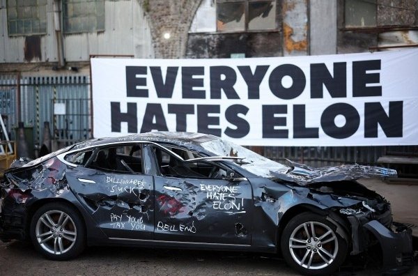 Незвичну акцію провели у Лондоні в рамках кампанії Everyone Hates Elon («Всі ненавидять Ілона»). Списаний електромобіль Tesla Model S придбали на звалищі. Авто розбили кувалдами та бейсбольними бітами.