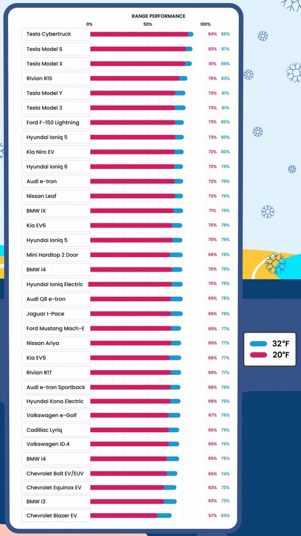 Переможцем тесту став електропікап Tesla Cybertruck, який зберіг 88% паспортного запасу ходу при 0° і 84% - при -7°. Друге місце посів електромобіль Tesla Model S - 87% і 82%, відповідно.