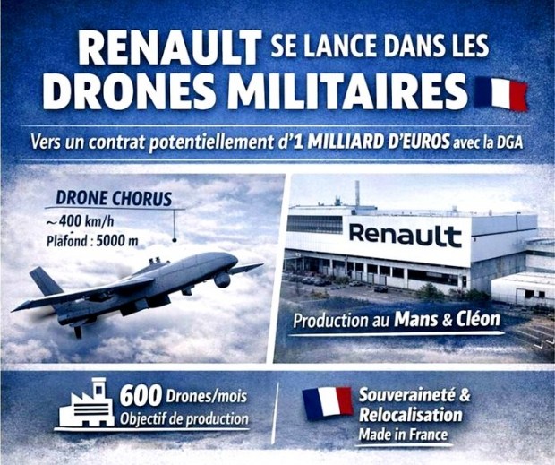 Renault перепрофільовує свої заводи у Ле-Мані та Клеоні на виробництво далекобійних дистанційно керованих дронів, що розроблені у співпраці Turgis Gaillard.