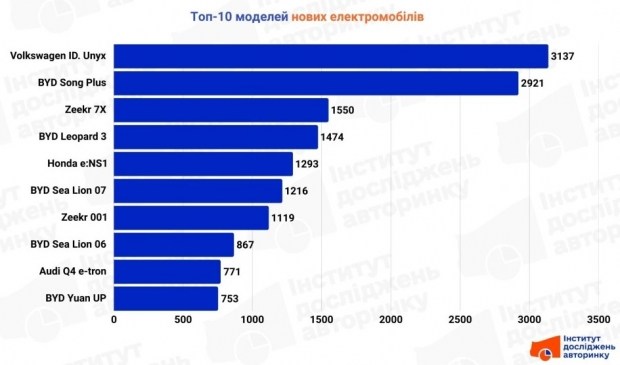 У модельному рейтингу на перше місце несподівано вирвався Volkswagen ID. Unyx, який став справжнім хітом завдяки своєму дизайну. Він зумів обійти навіть багаторічного фаворита - свого родича VW ID.4, та кросовер BYD Song Plus, який залишається головним вибором прагматиків.