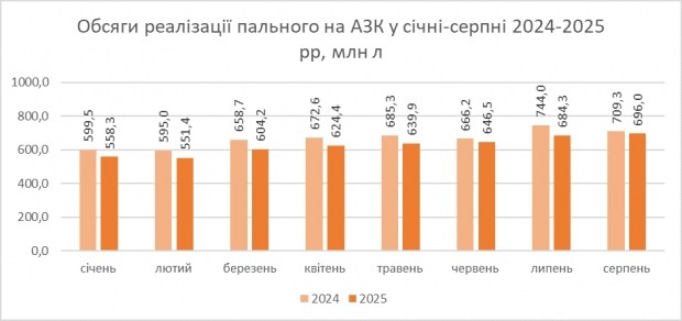 У серпні 2025 року обсяги реалізації всіх видів пального на заправних комплексах становили 696 млн л, що на 2% менше, ніж за аналогічний період 2024 р. Про це свідчать дані Державної податкової служби України.