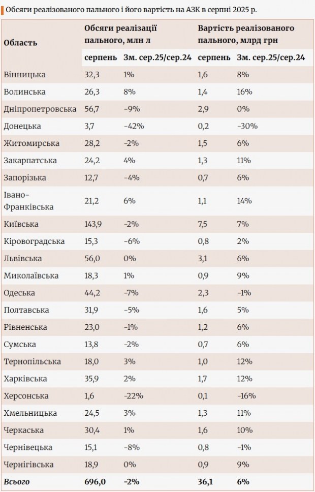 У столичному регіоні, найбільшому в країні за споживанням, зафіксоване зниження - на 2% порівняно з серпнем 2024-го (майже 144 млн л). Водночас в гривневому еквіваленті виторг зріс на 7%, до 7,5 млрд грн.