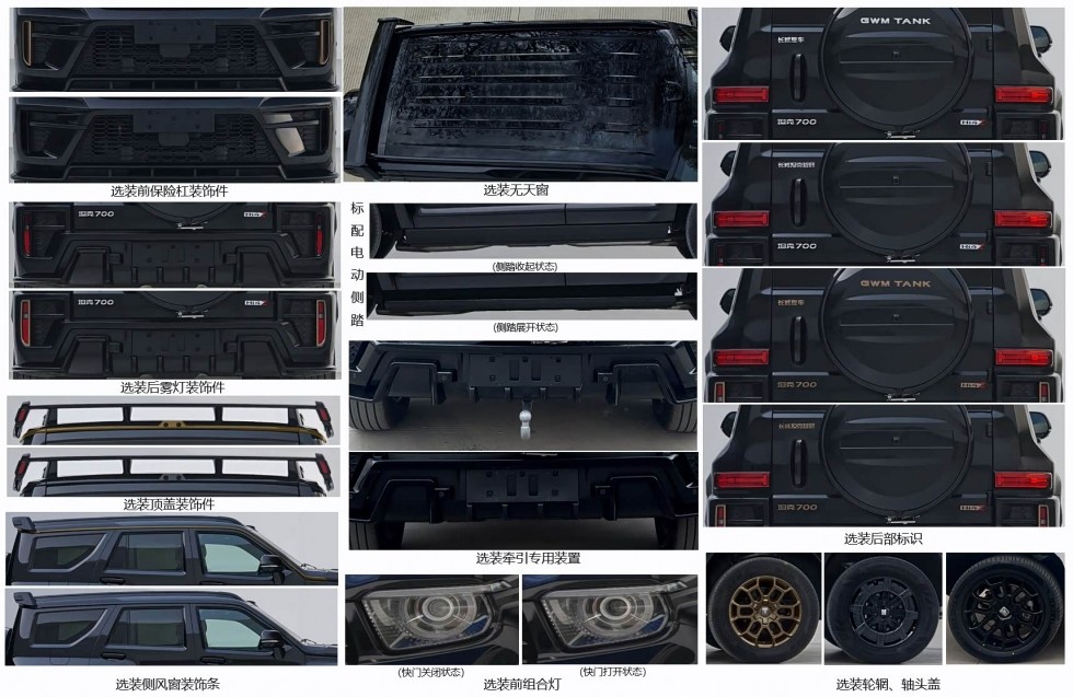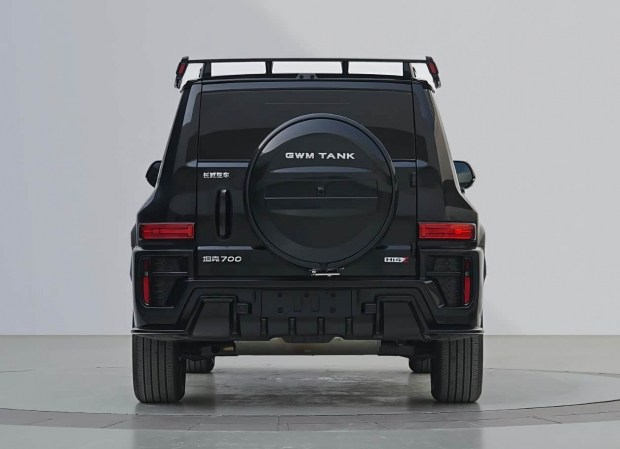 Задня частина отримала ефектний спойлер на даху, камеру, інтегровану по центру верхньої частини заднього скління, а також горизонтально відкривану задні двері зі встановленим на них запасним колесом. Нижня частина бампера доповнена масивним дифузором, що підсилює спортивні нотки в дизайні. За офіційними даними MIIT, габарити нового Tank 700 Hi4-Z становлять 5105 мм у довжину, 2061 мм у ширину та 1985 мм у висоту при колісній базі 3000 мм. Додатково передбачені декоративні накладки на передній і задній бампери, опційний люк на даху та золотисті емблеми, які додають автомобілю більш преміального вигляду.
