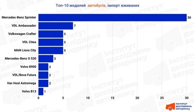 Цікаво, що у Топ-10 уже активно закріплюються великі європейські машини, які раніше потрапили в Україну як вживаний імпорт, а тепер змінюють власників усередині країни: це нідерландські VDL Ambassador та бельгійські Van Hool Astron. Також у списку присутні ветерани Volkswagen LT та Crafter, локальна Рута 25, рідкісний для наших широт Dodge Sprinter (американська версія «Мерседеса») та старий-добрий ПАЗ 3205.