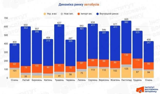 Минулого місяця на внутрішньому ринку було укладено 247 угод купівлі-продажу. Сегмент імпорту вживаної техніки поповнився на 85 одиниць, а нових автобусів було зареєстровано 98 штук (з яких левова частка - 84 одиниці - українського виробництва, і лише 14 прийшло за прямим імпортом). У динаміці до грудня ринок очікувано просів: внутрішні перепродажі впали на 24%, імпорт вживаних - на 25,4%, а нових імпортних машин стало менше на 44%. Проте в річному вимірі (Y-Y) внутрішній ринок підріс на 10,3%, а імпорт вживаних продемонстрував солідний плюс у 37,1%.