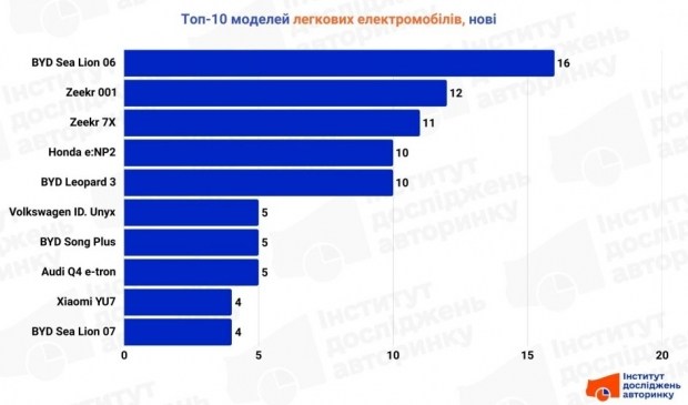 - BYD (Sea Lion 06, Leopard 3, Song Plus, Sea Lion 07): Бренд домінує завдяки широкій лінійці кросоверів та власним інноваційним акумуляторам.