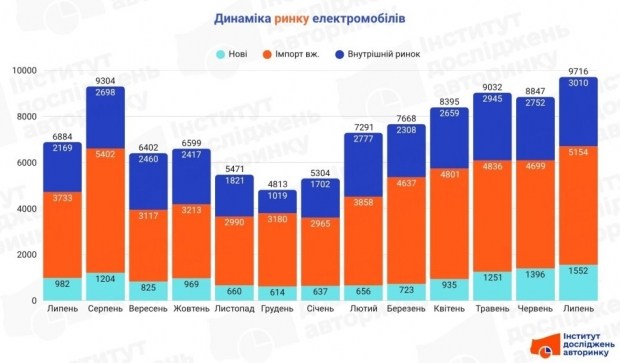 Сумарний обсяг сегмента електромобілів за підсумками липня 2025 року склав 9,7 тис., що на 9,8% більше, ніж було у червні поточного року, та на 41,1% більше відносно торішніх показників липня-2024.